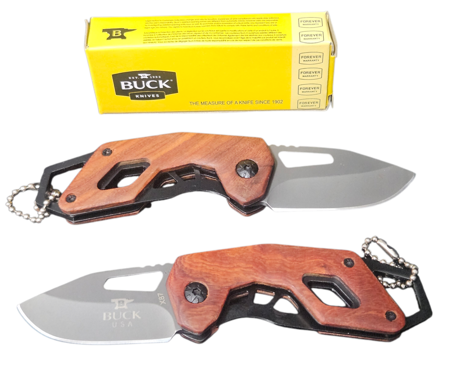 This Buck Knife has a blade of 5cm and a wooden handle of 8,5cm.