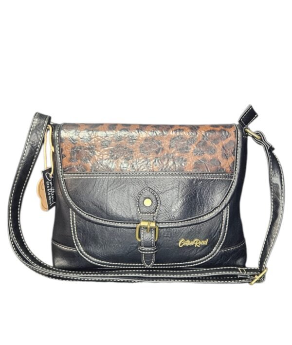 This sling bag is made from PU Leather with animal print. Lined on the inside with a pocket with a zipper and a pouch. The bag has a zipper and pouch at the back and a pouch at the front under the fold over flap. The bag has a zipper to close the big compartment and a magnetic clip to secure the flap in place. The shoulder strap is adjustable.