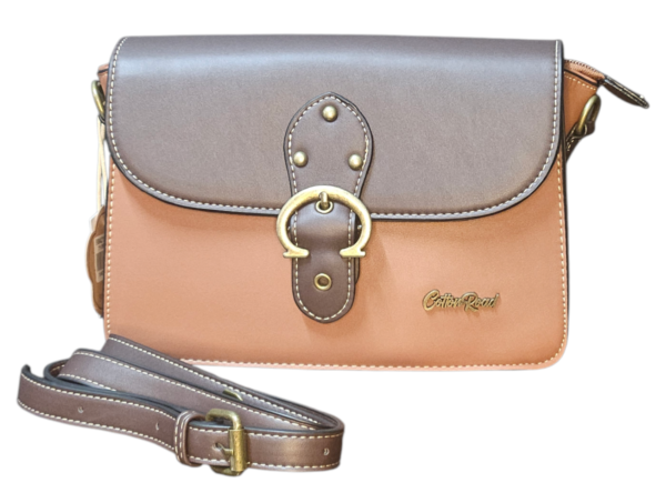 This sling bag is made from PU leather it is lined on the inside with a pouch with a zipper and an extra pouch. the bag has a zipper at the top and a flap that closes with a magnetic clip on the front. The shoulder strap is adjustable.