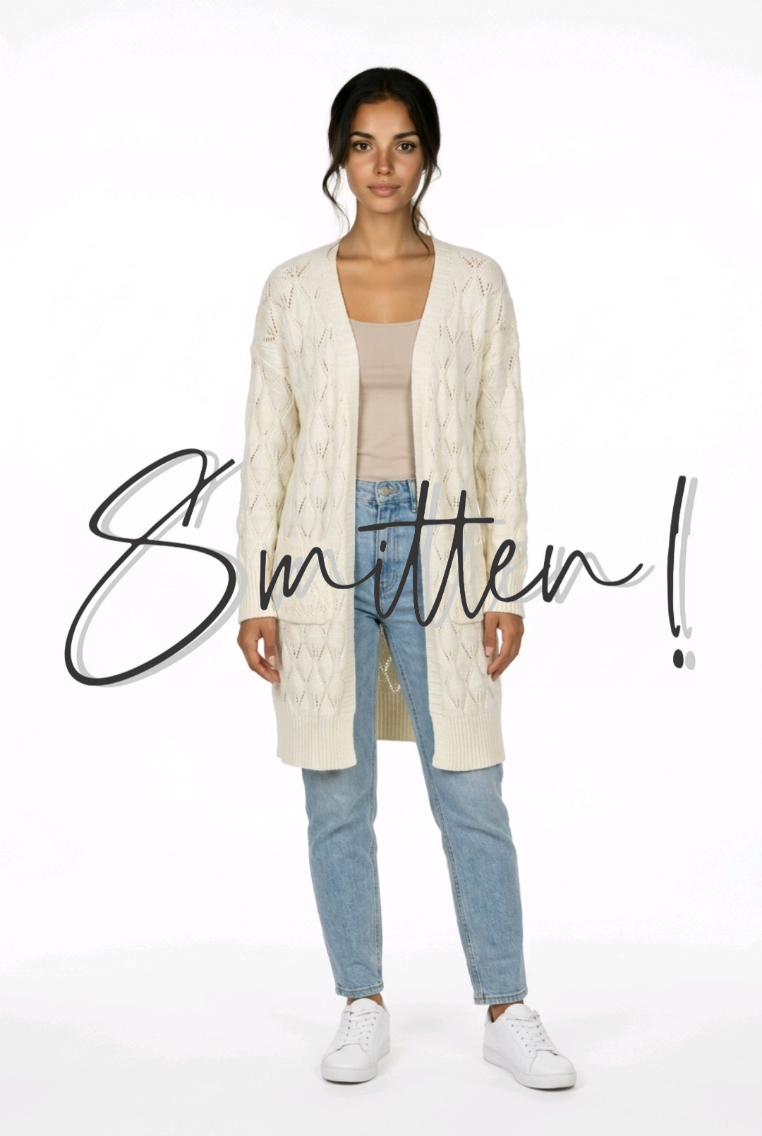 This stylish, open-front longline cardigan is a versatile addition to any wardrobe. It features a unique all-over textured diamond knit that adds depth and a touch of elegance to its relaxed silhouette. With its soft cream and convenient side pockets, it’s the perfect layering piece for a cozy yet polished look.
