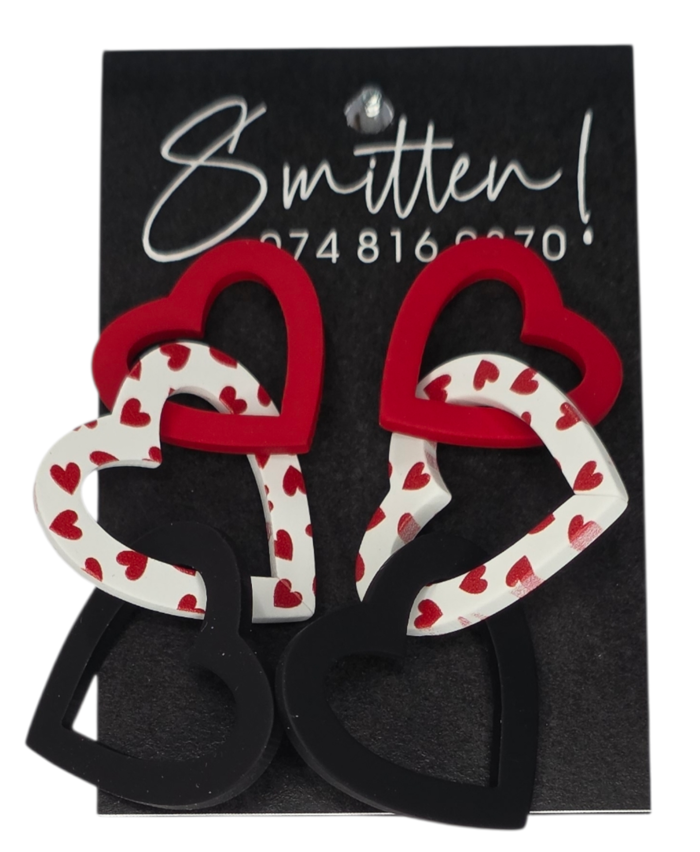 3 Heart Shape Earring Red, White with little hearts and Black at bottom