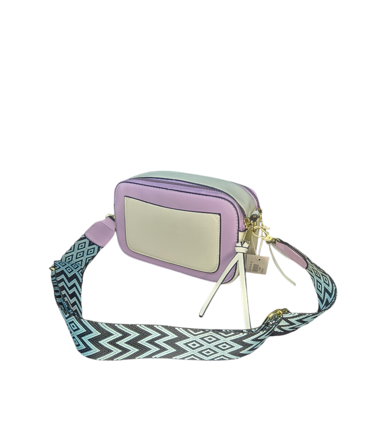 This Stylish multi color bag is lined on the inside. The bag is a one compartment with two zippers and a removable shoulder strap. The shoulder strap is adjustable (black and blue)