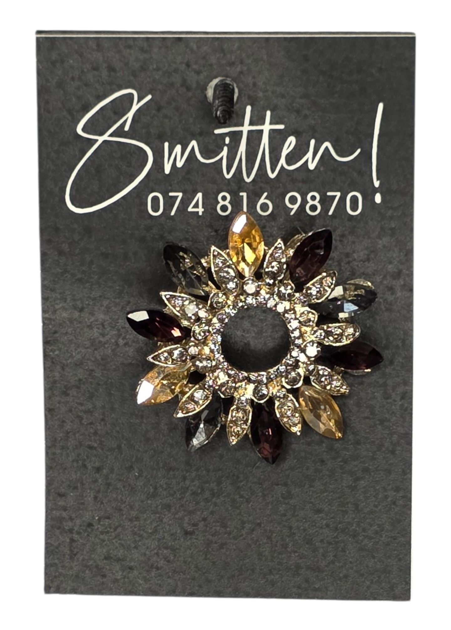 - Colors: A sophisticated mix of champagne, amber, and deep chocolate brown crystals in a polished gold-tone setting.